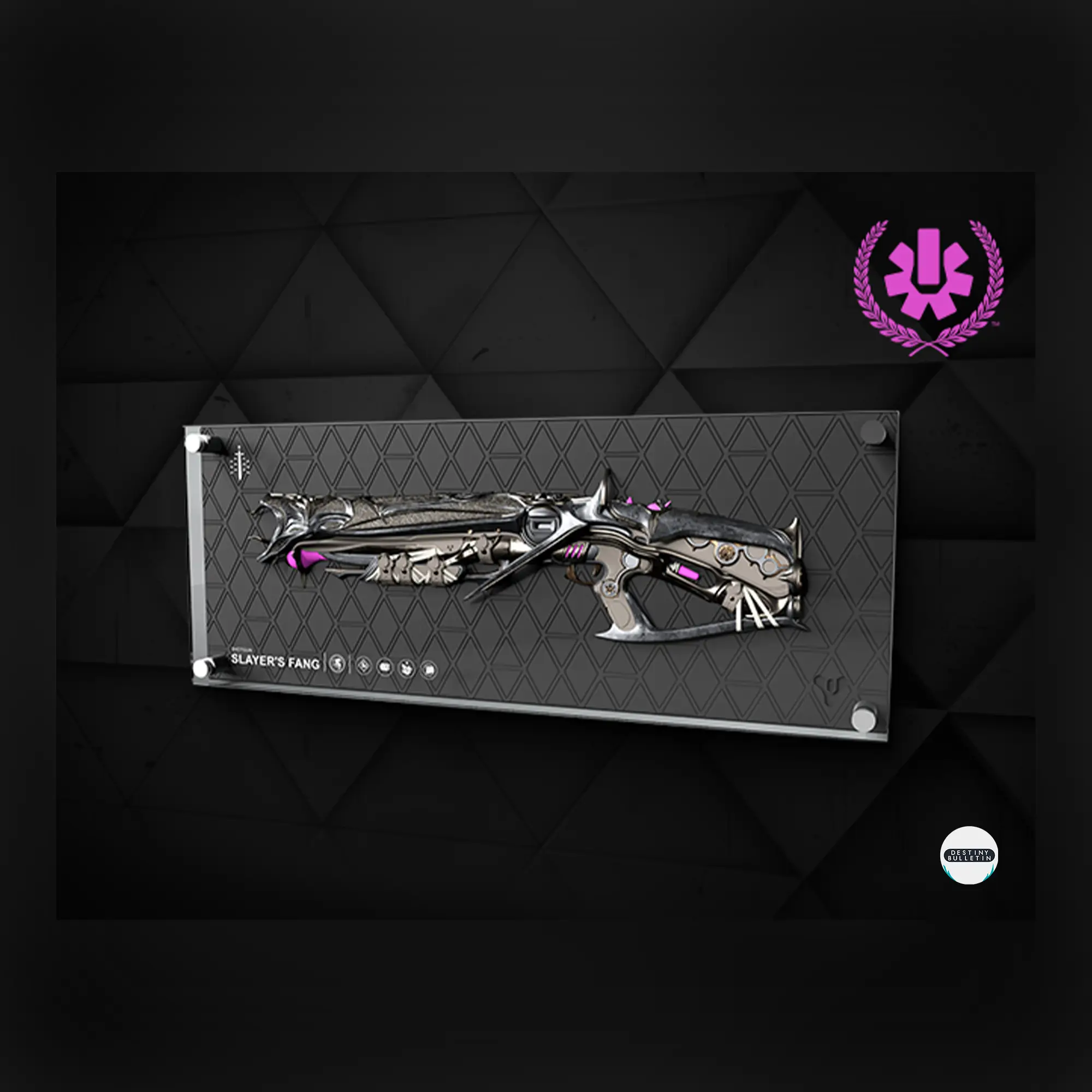 The second image showcases a Bungie Rewards collectible—an “Exotic Armory Collection” display for Slayer’s Fang. This reward will likely be tied to completing the Kell’s Fall mission and acquiring the weapon itself, with players able to purchase it from the Bungie Store to commemorate their in-game achievement.