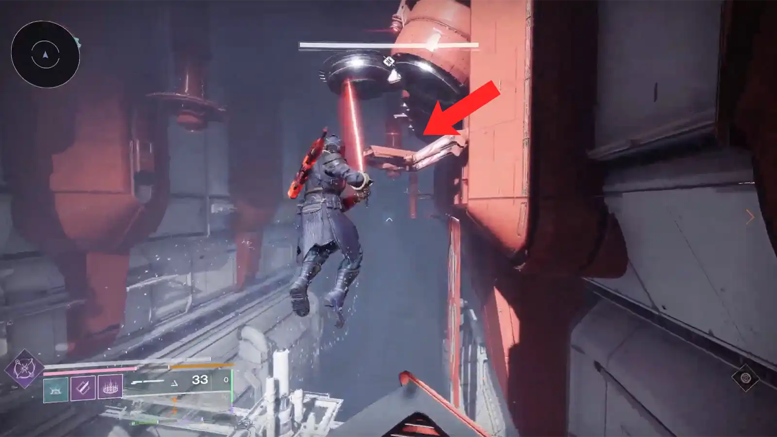 From there, follow the outer platforms all the way to the far end and then turn left. You’ll see two red-lit switches. Activate both to open the door on the left wall, then jump inside and start descending. Your goal here is basically “go down and forward,” so drop to the lowest level you can safely reach, then continue moving along the ship’s underside using the red-lit platforms as your main route.