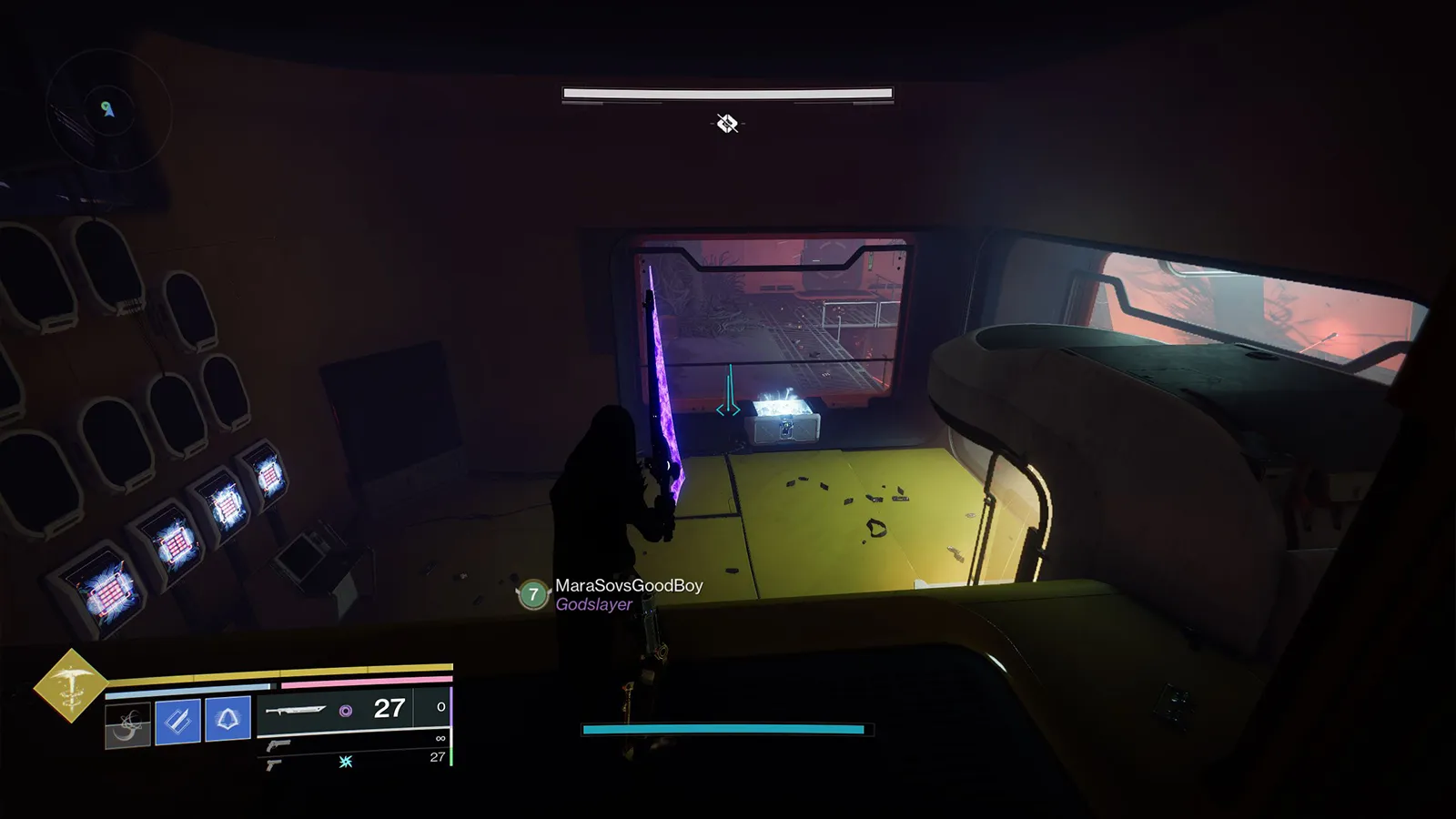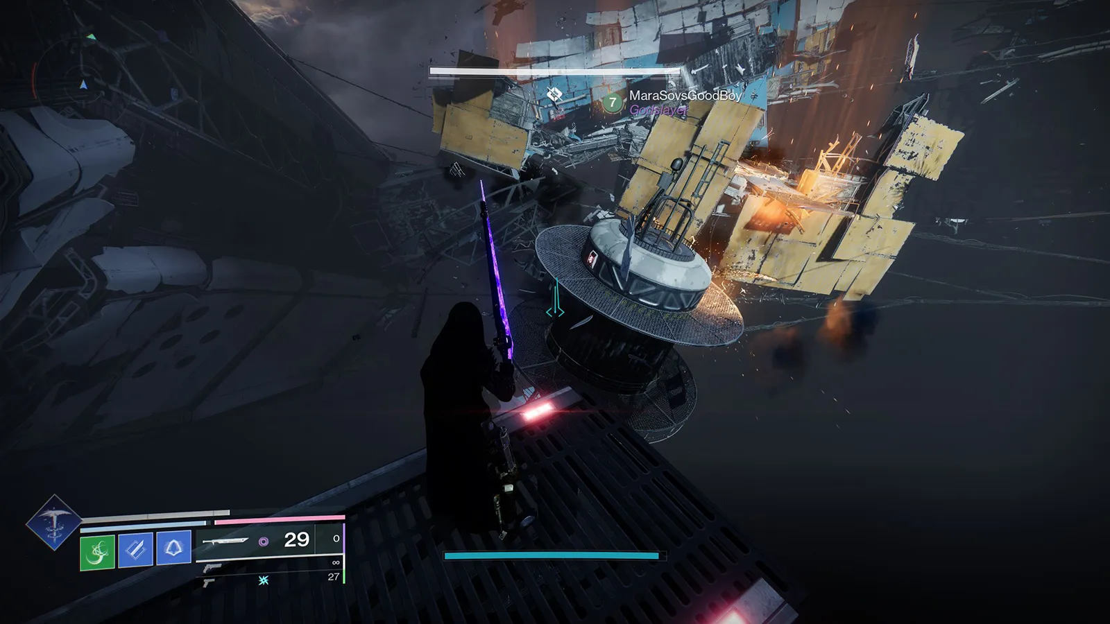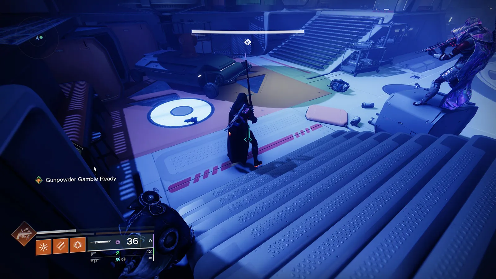 Once you’ve taken down the Machine Priest, move ahead and jump on the stationary platforms. Look for a Scanner and an Operator augment on one of the hollow platforms. Pick up the augments, and use the Operator augment to shoot the panels that disappear from the Scanner’s map. Keep doing it until you receive an Ascendant Alloy reward.