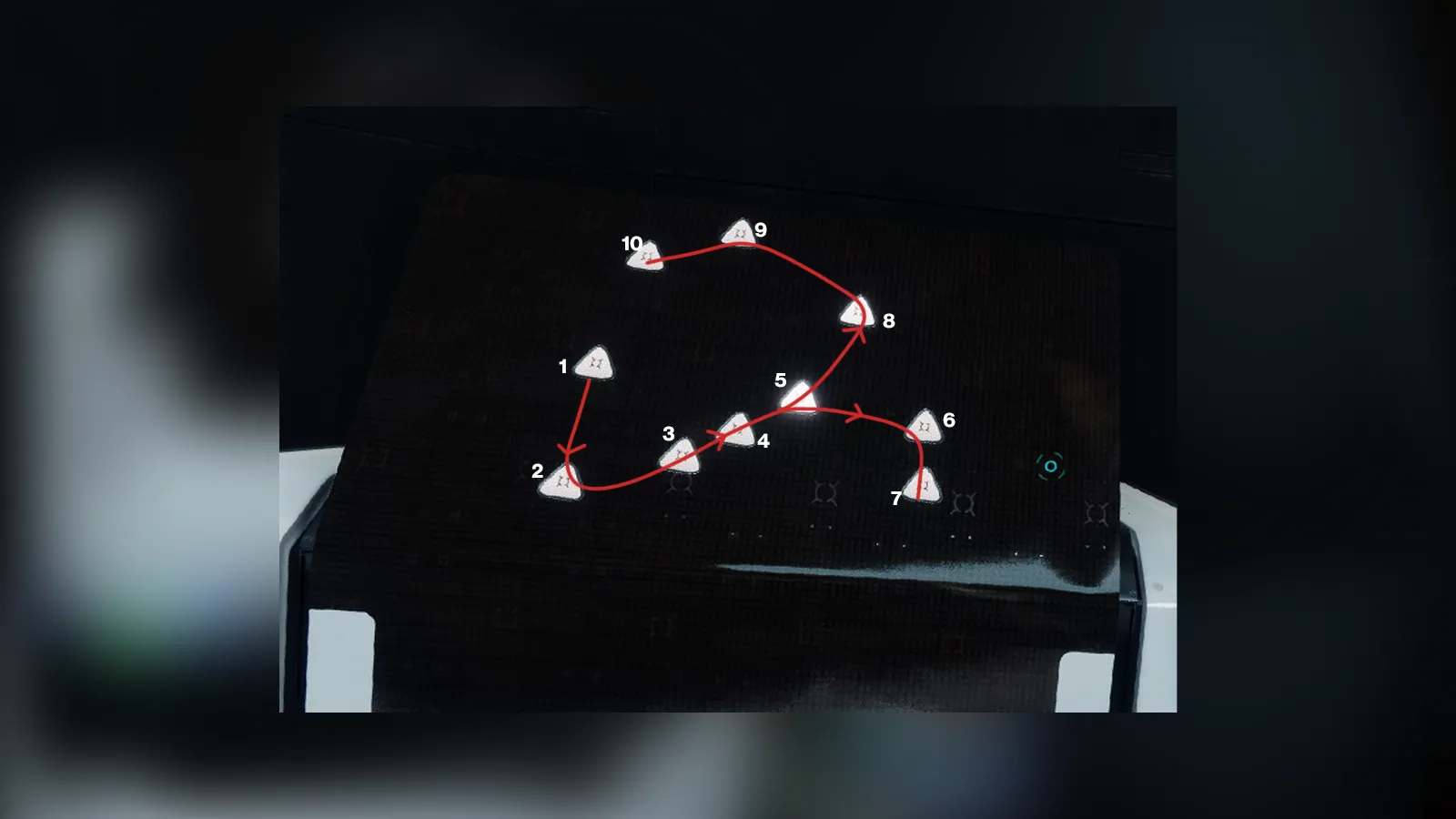 This puzzle works similarly to the previous one, but now involves ten nodes. Start by interacting with the terminal, then locate the blinking nodes and activate the corresponding plates.
