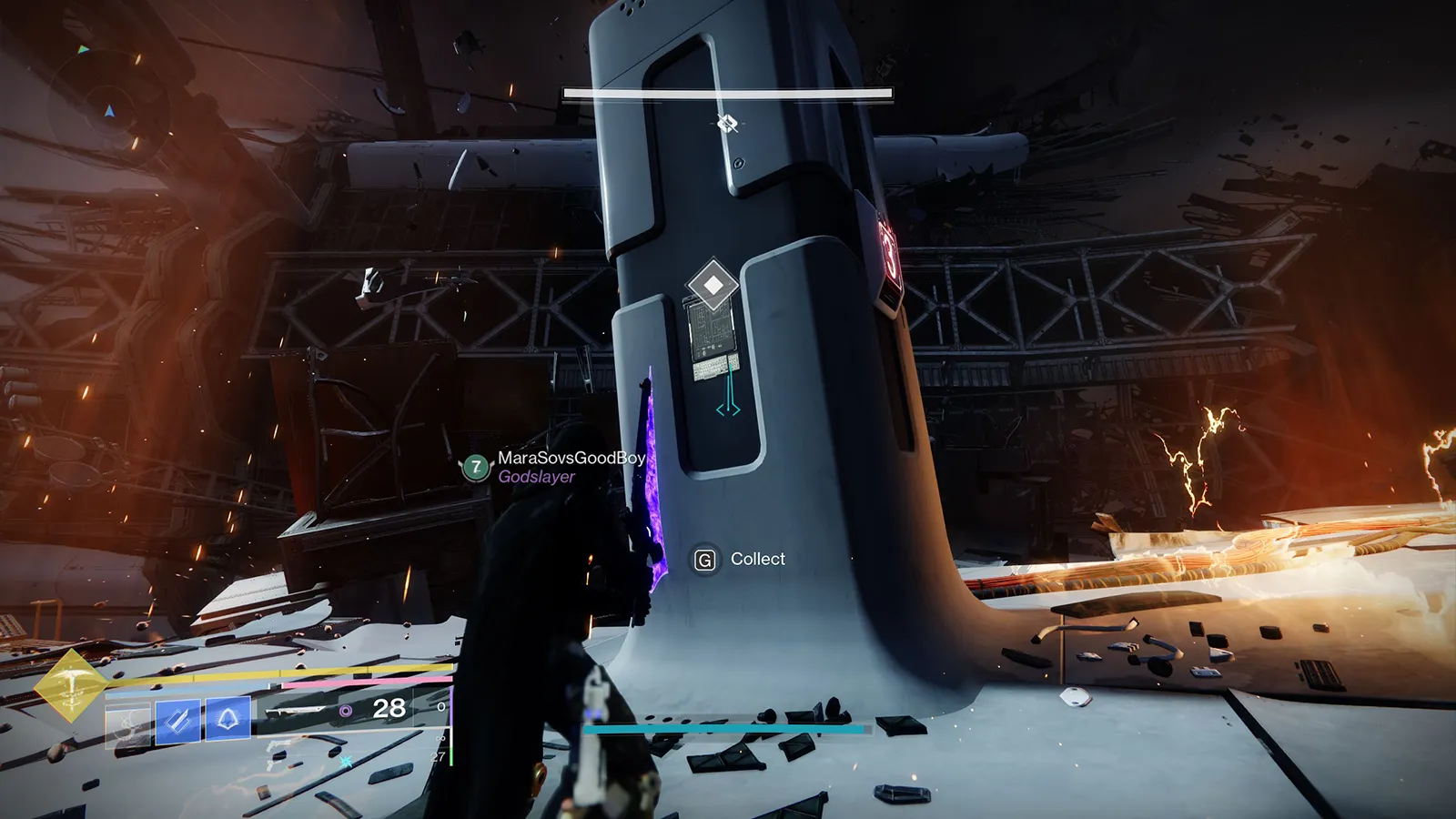 After reaching the fourth Nuclear Core deposit box, continue moving forward until you come across a debris-filled area. Jump over the debris, and look for a door on your left. Open it, and inside, you’ll find the first secret chest. Opening this chest will progress the quest.