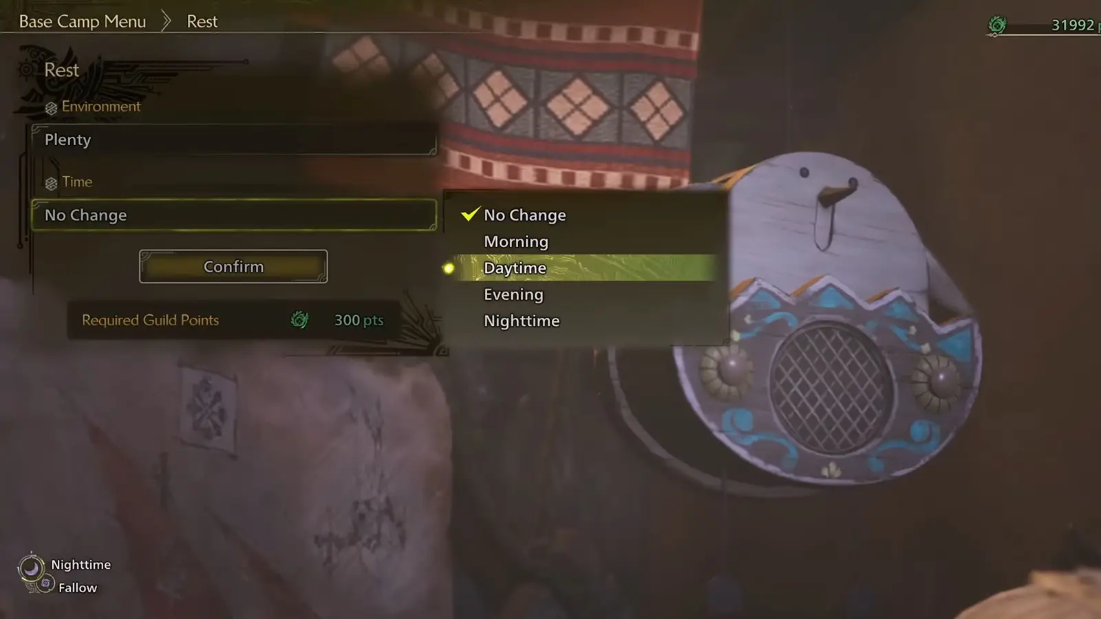 Can you change the weather in Monster Hunter Wilds? Yes! To do so, go to the Base Camp Menu > BBQ Menu > Rest. Under here, you’ll be able to change the Environment settings to your liking, as well as the Time of Day. Changing this setting costs 300 Guild Points.